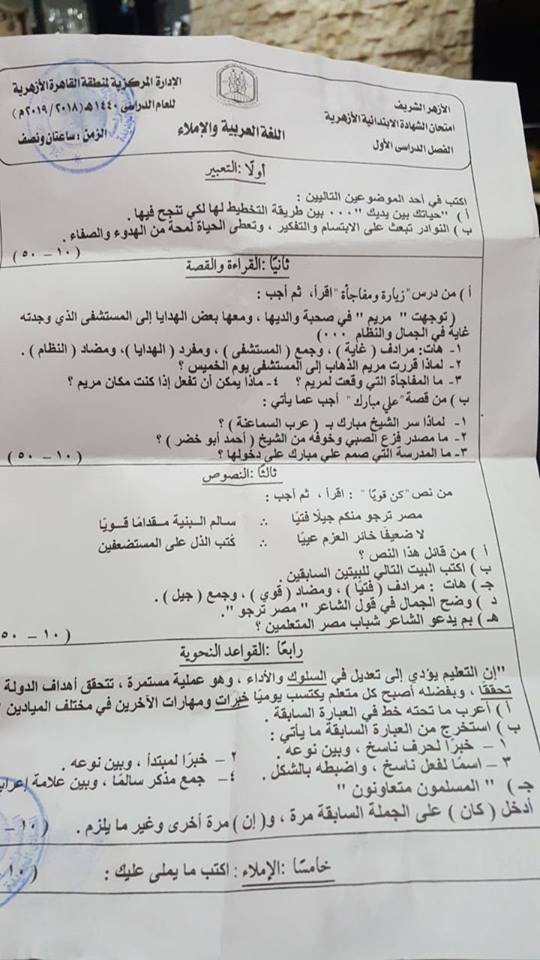 ورقة امتحان اللغة العربية للصف السادس الابتدائي الازهري الترم الاول 2019 محافظة القاهرة