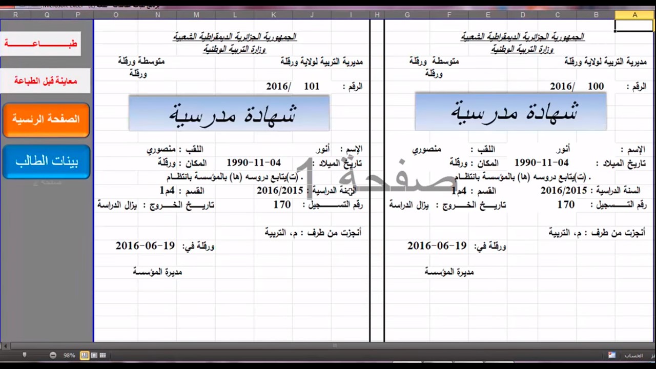 شهادة مدرسية تحريرها باستعمال الاكسيل
