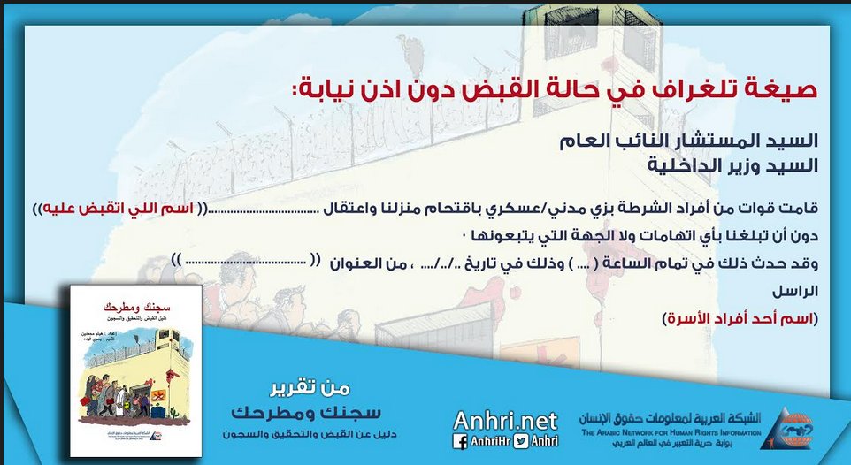 Gamal Eid Twitter પર صيغة تلغراف للنائب العام و وزير الداخلية في حالة القبض أو الاختطاف سهل عمله لكن دوره شديد الاهمية في حمايتك لانه بيحميك من الفبركة أو
