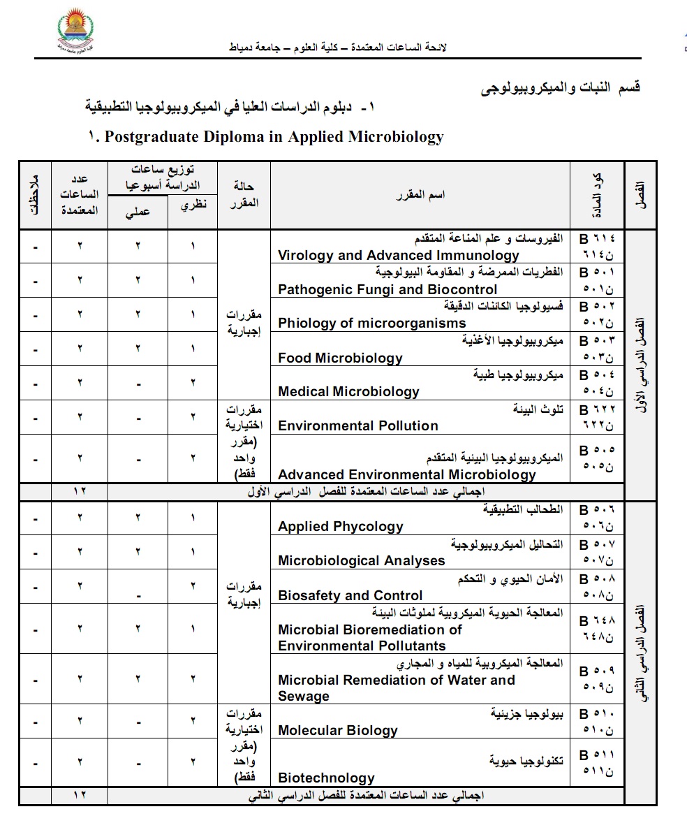 جدول دبلوم الميكروبيولوجيا التطبيقية لعام 2019 كلية العلوم جامعة سوهاج