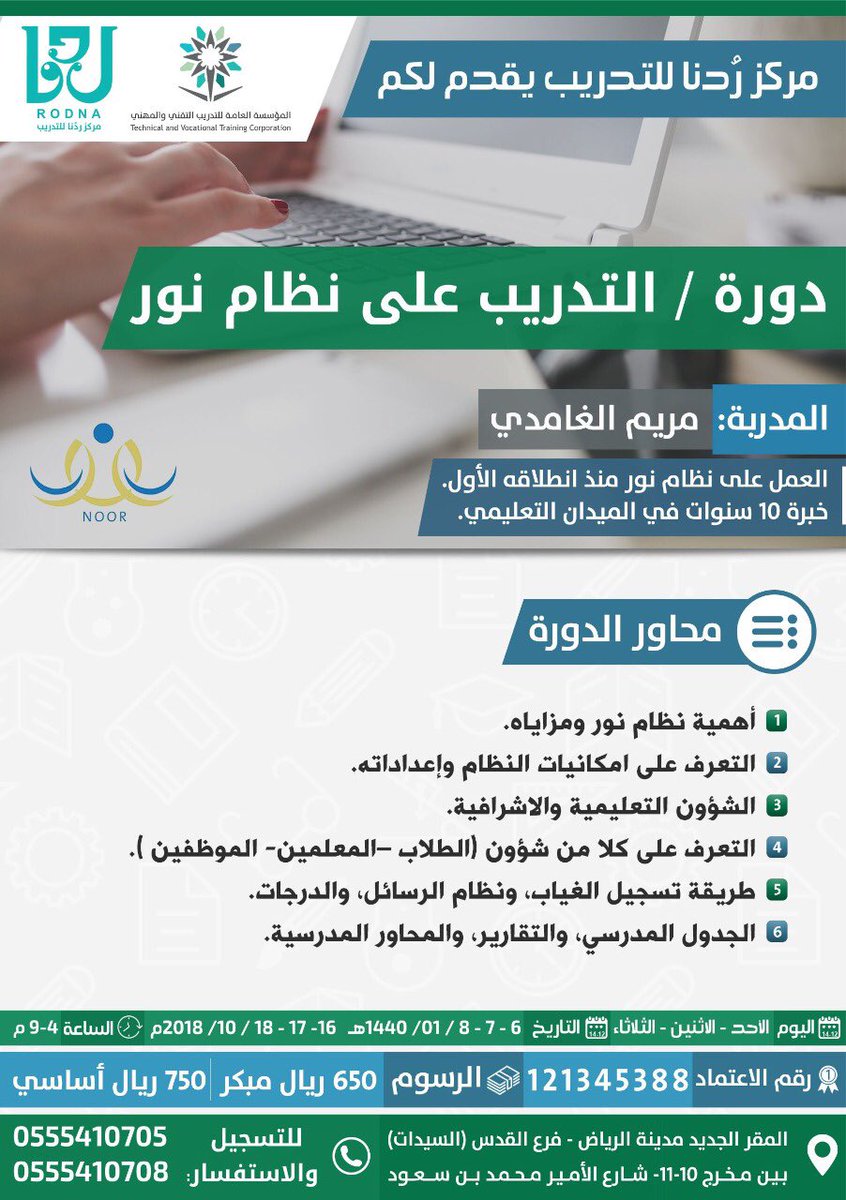 مركز ر دنا للتدريب On Twitter مركز ر دنا للتدريب يقدم دورة التدريب على نظام نور ما هو نظام نور وأقسامه وخطوات العمل عليه بادري بالتسجيل لرفع آداءك الوظيفي للتسجيل ٠٥٥٥١٤٧٧٤٤