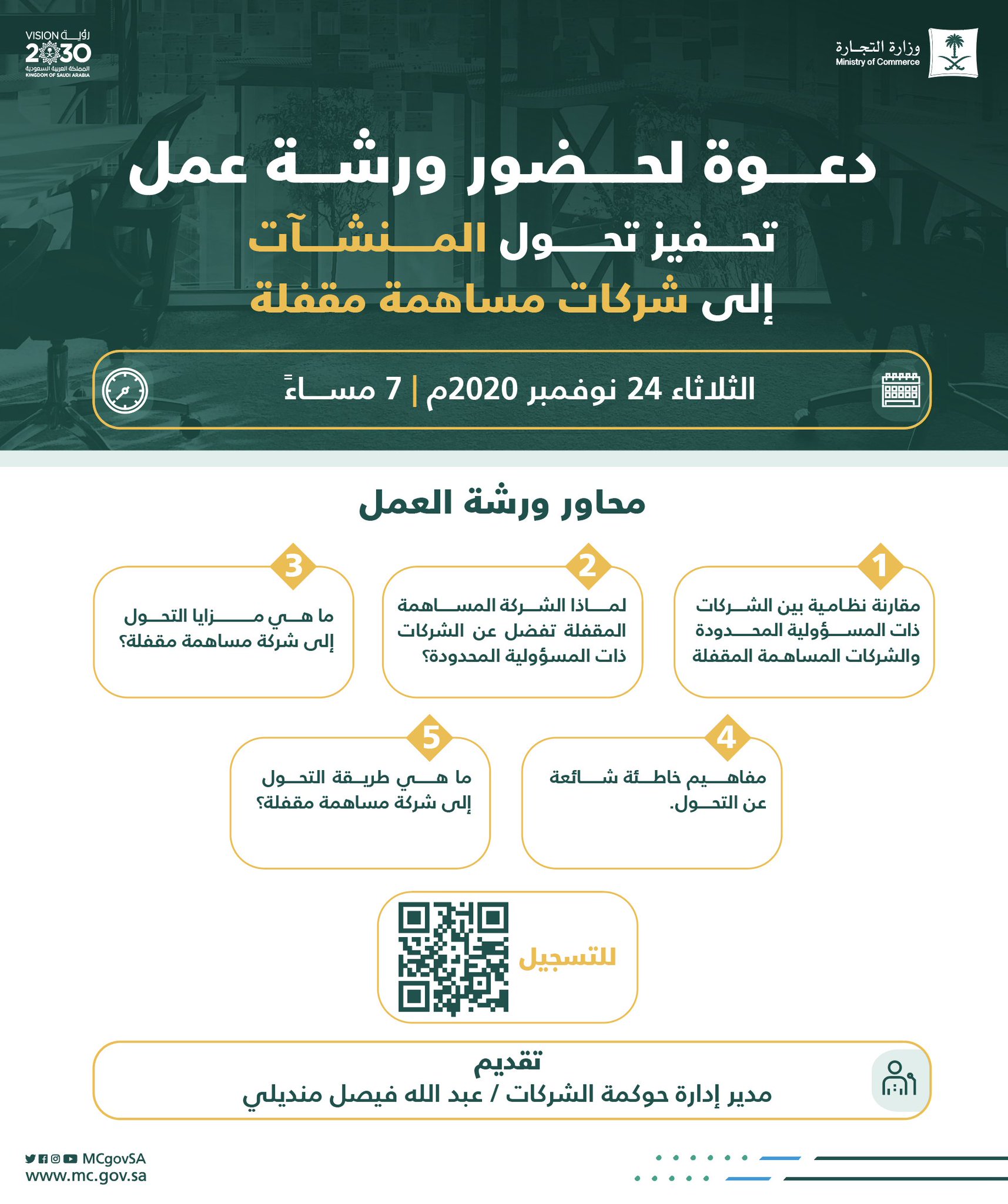 وزارة التجارة On Twitter دعوة لحضور ورشة عمل تحفيز تحو ل المنشآت إلى شركات مساهمة مقفلة الثلاثاء 24 نوفمبر 2020 7 مساء