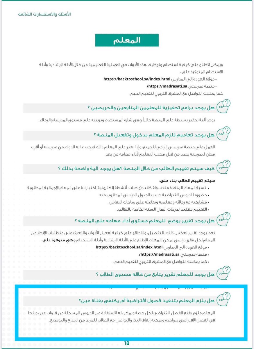 المختصر التعليمي On Twitter يسألني الكثير عن إمكانية رفع الدرس بأي وقت فإجابتي نعم لكن هنا ذكر أن المعلم ملزم بفتح الفصل الافتراضي لكل حصة وفي تصو ري أن