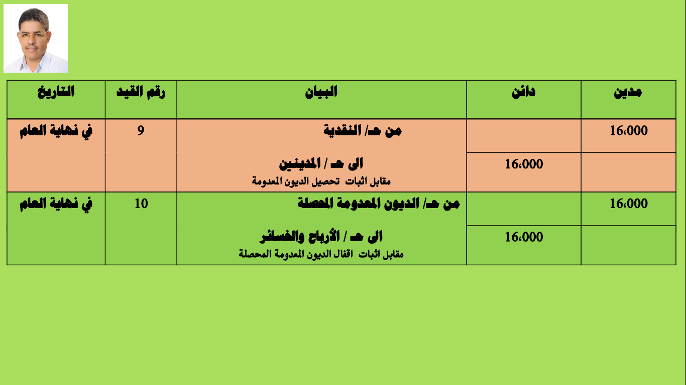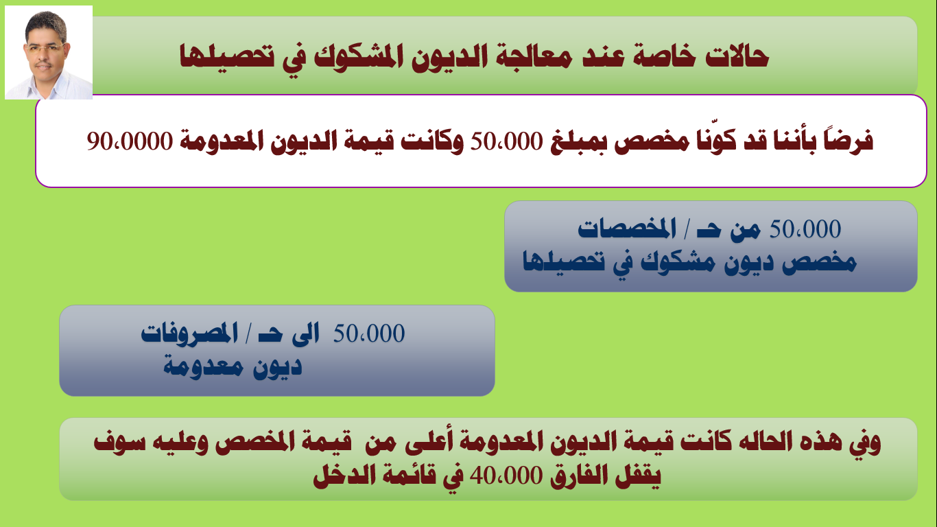 المعالجة المحاسبية للديون المعدومة ومخصص الديون المشكوك فيها ملخص بكافة القيود خلال الفترة المالية شبكة أجداور