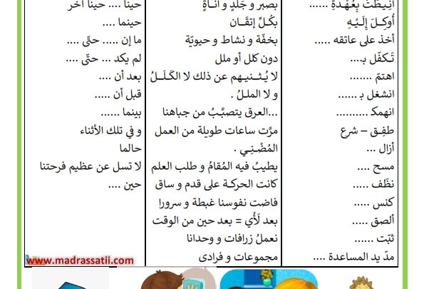اللغة العربية أوراق عمل نشيد التعاون للصف الرابع مع الإجابات ملفاتي